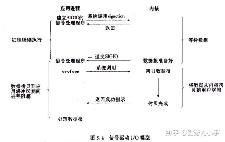 术语:首先开启套接字中的信号驱动IO功能,并通过系统调用signification执行一个信号处理函数,此时请求立即返回;当数据准备完毕后,生成对应进程的SIGIO信号,通过信号回调通知应用线程调用recvfrom函数