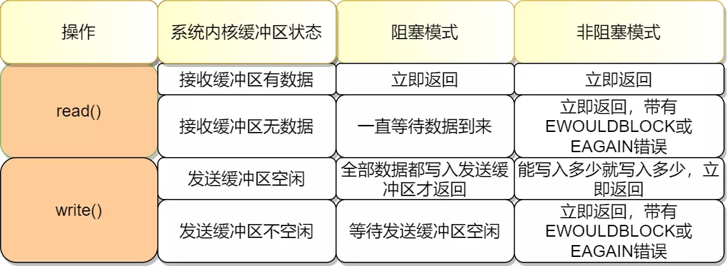 我们知道每个套接字Socket都有一个接收缓冲区,如果缓冲区为空,阻塞IO会直接阻塞直到数据可读,非阻塞IO则会返回一个EWOULDBLOCK状态,触发轮询 - 2)写操作
