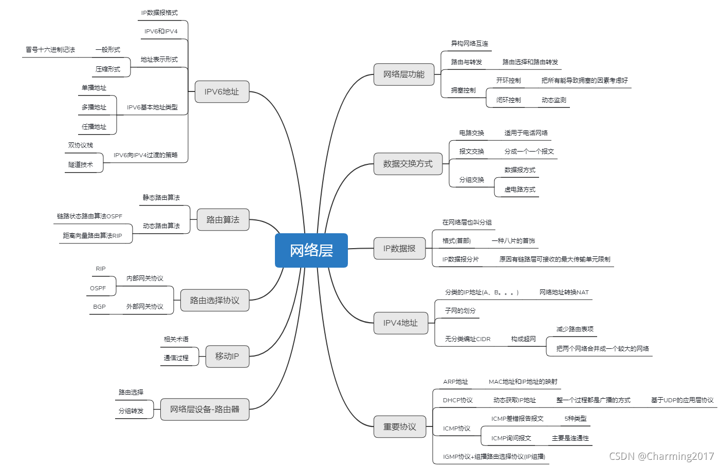 - 网络层功能概述,主要任务是把分组从源端传到目的端,为分组交换网上的不同主机提供通信服务。网络层传输单位是数据报(分组跟数据报的关系?理解成父子关系)