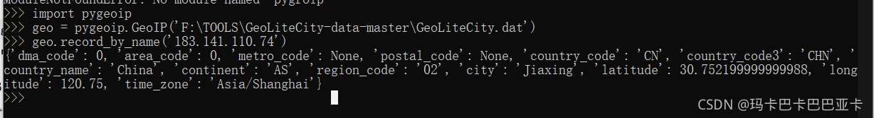geo = pygeoip.GeoIP('F:\TOOLS\GeoLiteCity-data-master\GeoLiteCity.dat')