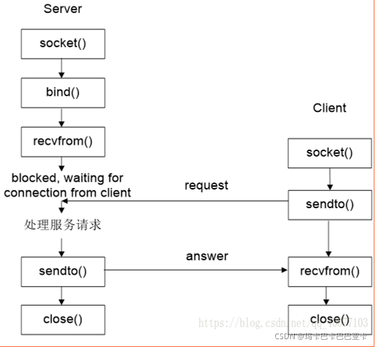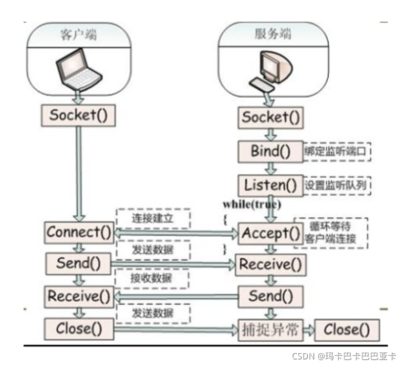 - 服务器端先初始化Socket,然后与端口绑定(bind),对端口进行监听(listen),等待客户端连接。
