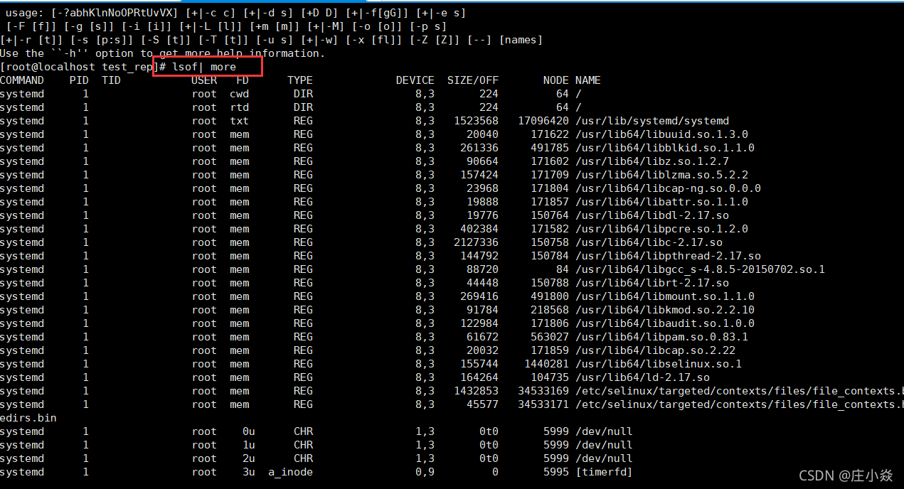 -c 选项将会列出所有以mysql这个进程开头的程序的文件,其实你也可以写成 lsof | grep mysql, 但是第一种方法明显比第二种方法要少打几个字符;