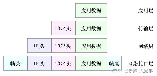 ? ? ? ? ?简单的理解就是:传输层再应用数据前加了TCP头,网络层再TCP头前面又加了IP头,而网络接口层又在IP头前面加了帧头.当然他们都是更具特定的协议格式进行添加!