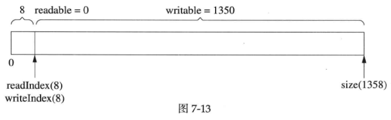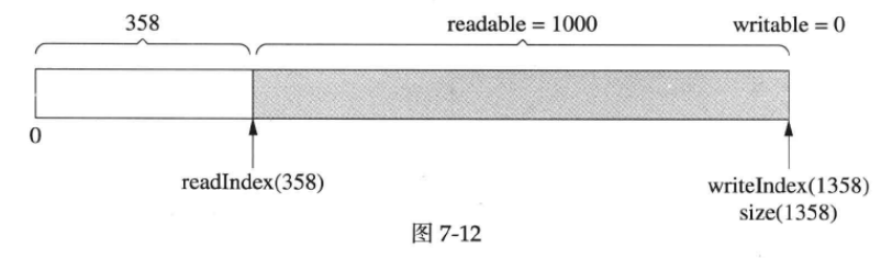 最后,读完剩下的1000字节,readIndex 和writeIndex 返回kCheapPrependable ,如下图7-13所示。