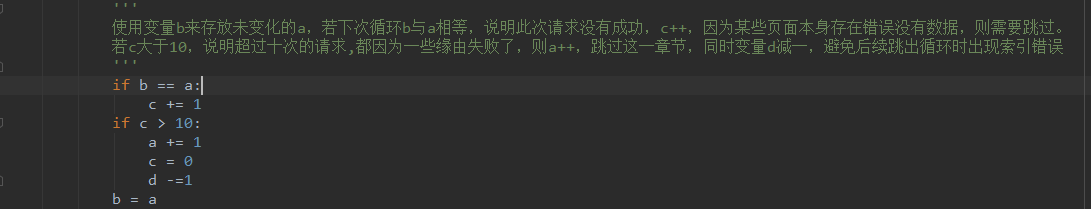 1,使用变量b来存放未变化的a,若下次循环b与a相等,说明此次请求没有成功,c++,因为某些页面本身存在错误没有数据,则需要跳过。 2,若c大于10,说明超过十次的请求,都因为一些缘由失败了,则a++,跳过这一章节,同时变量d减一,避免后续跳出循环时出现索引错误