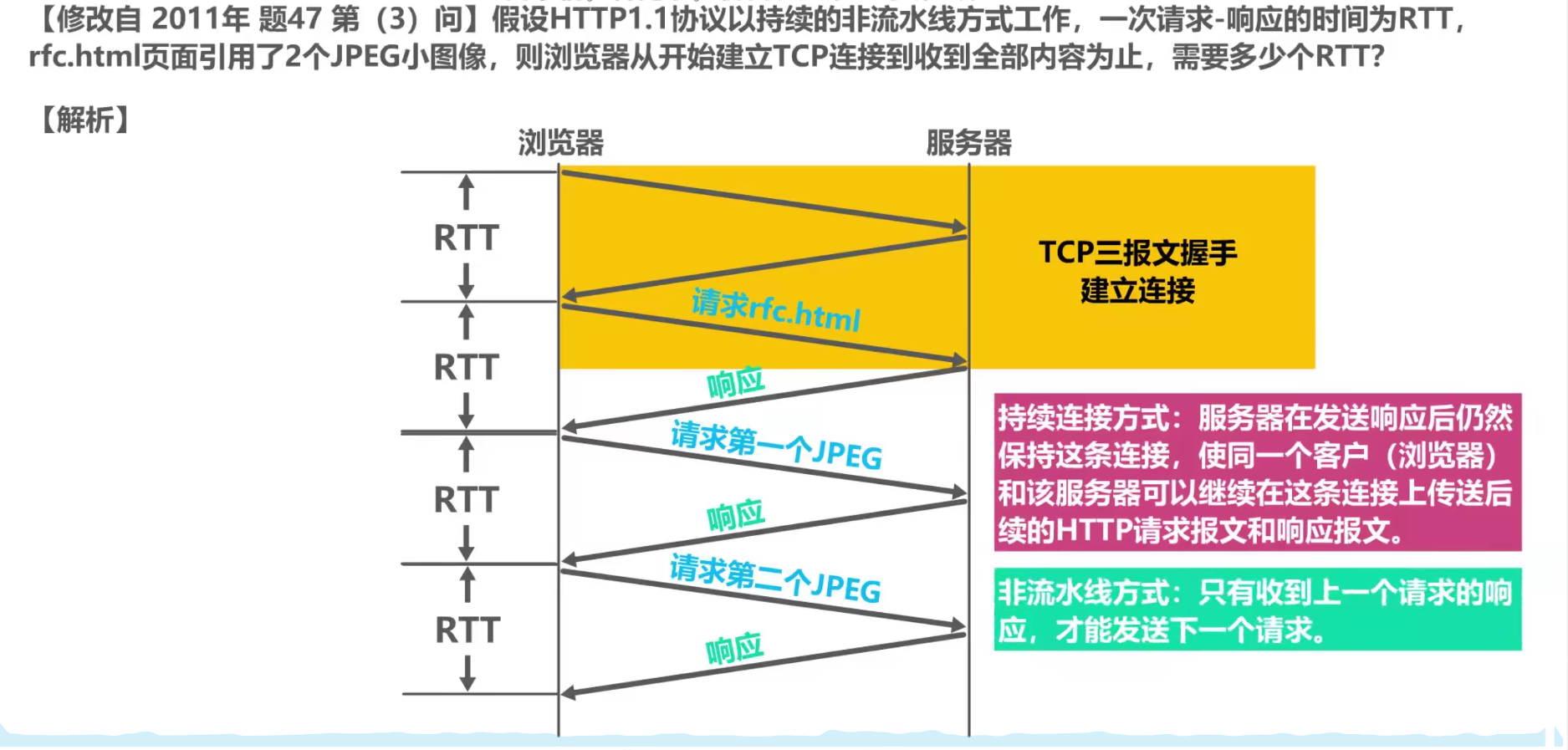- 当使用HTTP/1.0协议进行通信的时候,要注意这已经使用了2RTT的时间,如果在后面需要请求,图片视频等其他文件,需要的时间会更长。因此使用HTTP的最小时间是2RTT。