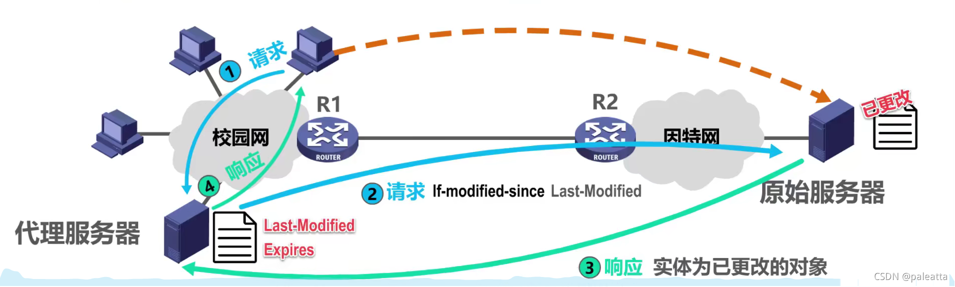 - 同步问题在代理服务器上有过期时间,如果过期时间到了就向原服务器发送请求,如果文件没有更改则返回304,不需要更改,代理服务器重置过期时间。如果文件已修改,则将修改后的文件发送到代理服务器更新文件。