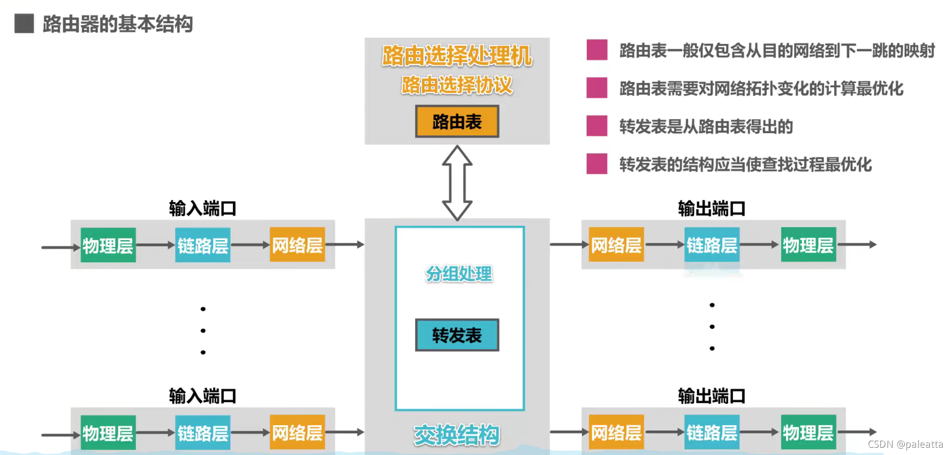 - 将目的地与路由表中的掩码进行相与操作,寻找其目的网络号,找到路由的接口,并转发。