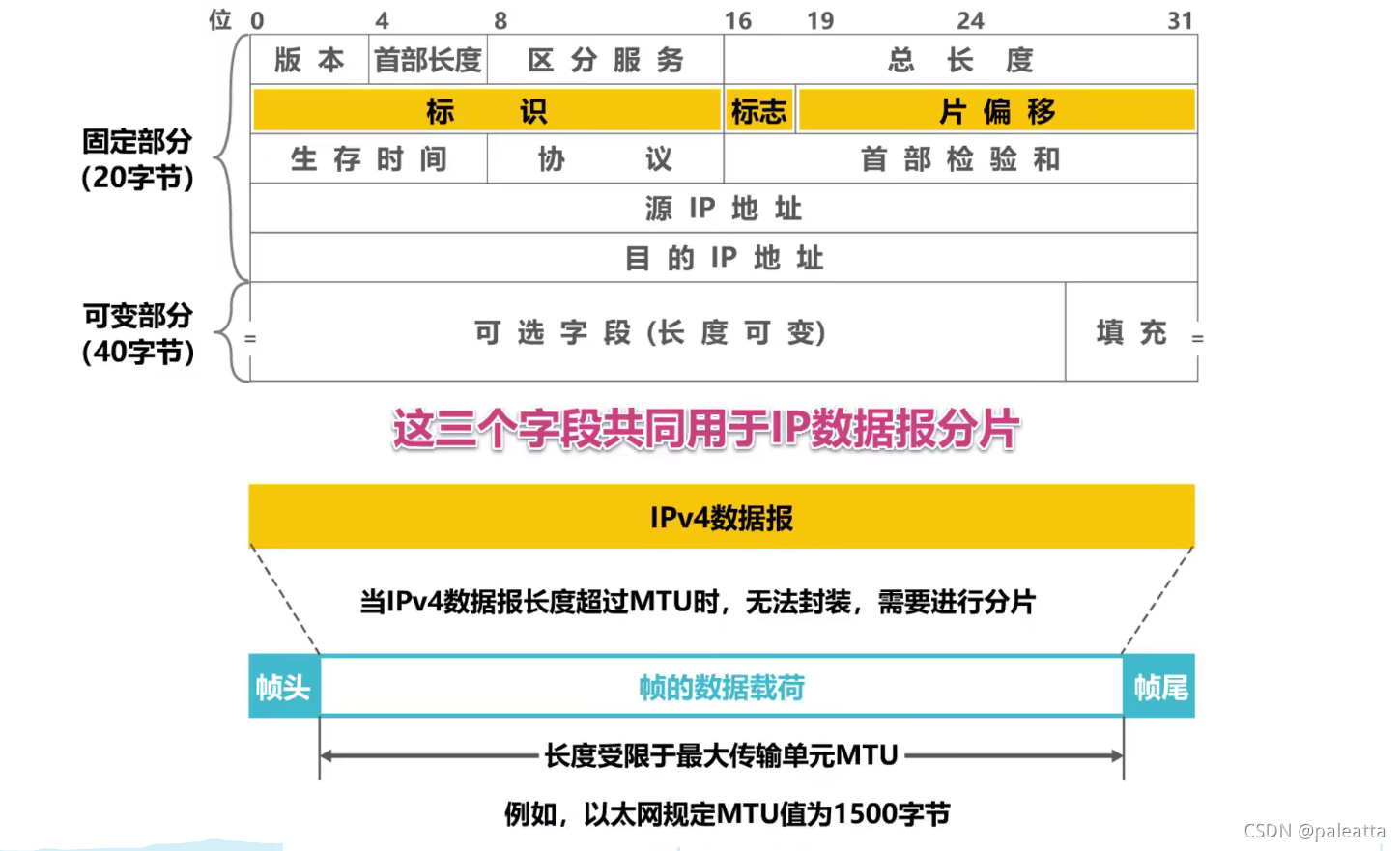 若IP分组总长度大于MTU,则需要进行分片,此时总长度字段、标志字段、片偏移字段都需要修改。