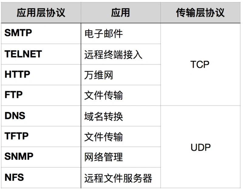 1.包总量较少的通信(DNS、SNMP等); 2.视频、音频等多媒体通信(即时通信); 3.限定于 LAN 等特定网络中的应用通信; 4.广播通信(广播、多播)。 UDP 和 TCP 的应用 他们的应用如下图: