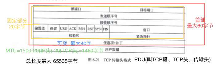 ①TCP协议 TCP 协议提供面向连接的、可靠的传输服务,适用于各种可靠的或不可靠的网络。 面向字节流按顺序、全双工,可变滑动窗口、缓冲累积传送。协议号6。  源端口:16位,说明源服务访问点。 目标端口:16位,表示目标服务访问点。 发送顺序号 (32 位):本段中第一个数据字节的顺序号。 接收顺序号(32位):捎带接收的顺序号,指明接收方期望接收的下一个数据字节的顺序号。 偏置值 (4 位):传输头中 32 位字的个数。因为传输头有任选部分,长度不固定,所 以需要偏置值。 保留字段 (6位): 未用,所有实现必须把这个字段置全0。 标志字段 (6 位):表示各种控制信息,其中 URG : 紧急指针有效。 ACK: 接收顺序号有效。应答 PSH: 推进功能有效。 RST: 连接复位为初始状态,通常用千连接故障后的恢复。 SYN: 对顺序号同步,用于连接的建立。建立 FIN: 数据发送完,连接可以释放。结束 窗口 (16 位):为流控分配的信息量。可变 校验和 (16 位) : 段中所有 16 位字按模 i16-1 相加的和,然后取 l 的补码。校验所有。 紧急指针 (16 位):从发送顺序号开始的偏置值,指向字节流中的一个位置,此位置 之前的数据是紧急数据。 任选项(长度可变) : 目前只有一个任选项,即建立连接时指定的最大段长。 补丁:补齐 32 位字边界。