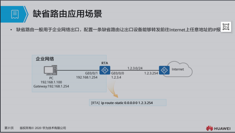 缺省路由时一种特殊的路由,当报文没有在路由表中找到匹配的具体路由表项才使用路由,如果报文的目的地址不能与路由表的任何目的地址相匹配,那么此报文将选取缺省路由进行转发。 缺省路由路由表中的形式为0.0.0.0/0 缺省路由也白叫做默认路由。