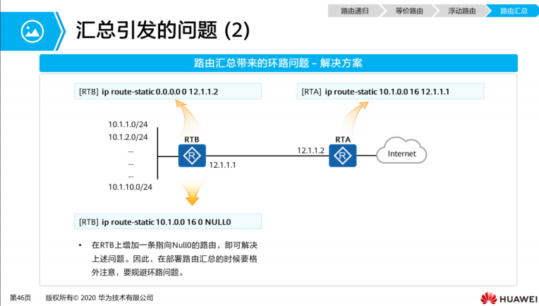 classless inter-domian routing 无类别域间路由,采用IP地址加掩码长度来表示网路和子网,而不时按照传统A、B、C等类型对网路进行划分。   ? 一般来说一条路由,无论是静态的或者是动态的,都需要关联到一个出接口,路由的出接 口指的是设备要到达一个目的网络时的出站接口。路由的出接口可以是该设备的物理接口, 例如百兆、千兆以太网接口,也可以是逻辑接口,例如VLAN接口(VLAN Interface),或 者隧道(Tunnel)接口等。在众多类型的出接口中,有一种接口非常特殊,那就是Null (无效)接口,这种类型的接口只有一个编号,也就是0。Null0是一个系统保留的逻辑接 口,当网络设备在转发某些数据包时,如果使用出接口为Null0的路由,那么这些报文将被 直接丢弃,就像被扔进了一个黑洞里,因此出接口为Null0的路由又被称为黑洞路由。