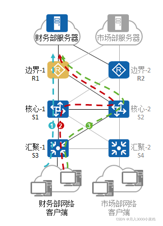 若网络正常运行,则S3(汇聚-1)会选择路径1。 若S1(核心-1)与R1间链路故障,则S3会选择路径2。 若S1设备故障,则S3会选择路径3。 ?