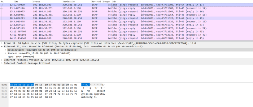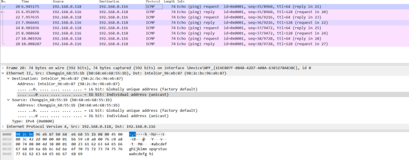 2.1 ping 旁边的计算机  目的MAC地址:98:2c:bc:96:eb:87 (即我同一子网下旁边那台计算机的地址) 源MAC地址:b0:68:e6:68:55:1b (即我的计算机地址) 类型:IPv4(0x0080) 2.2 ping qige.io  目的MAC地址: c8:ea:f8:32:83:10 (网卡地址) 源MAC地址:b0:68:e6:68:55:1b (即我的计算机物理地址)