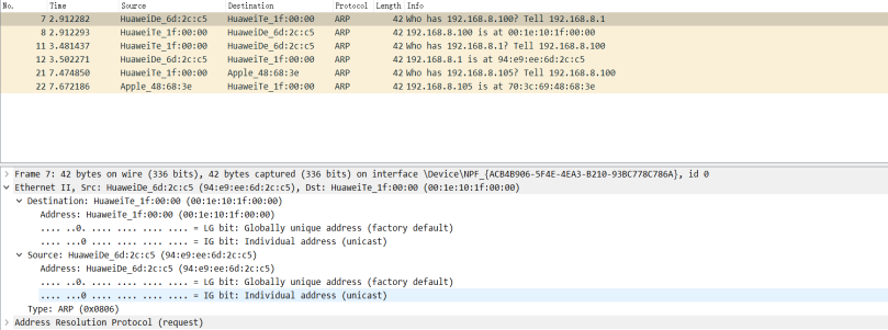 arp -d * 命令清空 arp 缓存  ping 你旁边的计算机(同一子网),同时用 Wireshark 抓这些包(可 arp 过滤),查看 ARP 请求的格式以及请求的内容,注意观察该请求的目的 MAC 地址是什么。再查看一下该请求的回应,注意观察该回应的源 MAC 和目的 MAC 地址是什么。