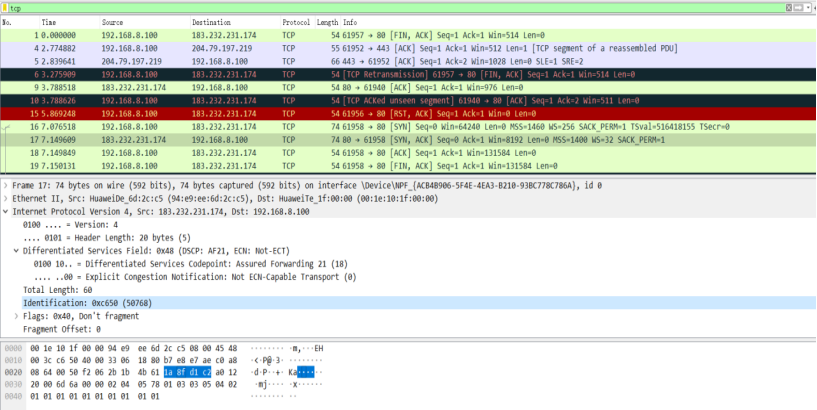 此处分段标志是0x2000,前面两个是保留位,后面其中一位是DF(不分段位), 0表示允许分段,1则表示不允许分段,还有一位就是MF(更多段位),0表示后面没有包,1则表示后面还有其他包。偏移量是用来标识数据包在数据流中的位置,也可以理解为同一个IP标识发送多个数据包时的顺序号。图片中偏移量为0,表明该包位于数据流的0号位置。每个包的大小是用Total Length来表示,它包含IP包头部及数据两个部分。