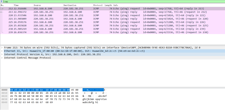 ping 命令只会向对方发送 32个字节的数据。我们可以使用 ping 202.202.240.16 -l 2000 命令指定要发送的数据长度。此时使用 Wireshark 抓包(用 ip.addr == 202.202.240.16 进行过滤),了解 IP包如何进行分段,如:分段标志、偏移量以及每个包的大小等。