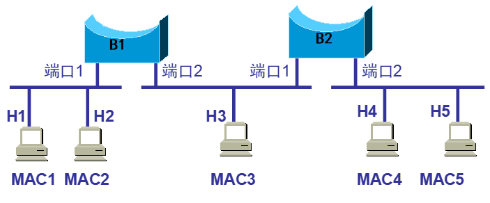 发送的帧 | 交换机B1的转发表 | 交换机B2的转发表 | 交换机B1的处理(转发?丢弃?登记?) | 交换机B2的处理(转发?丢弃?登记?) | 站地址 | 端口 | 站地址 | 端口 | H1→H4 | H1 | 1 | H1 | 1 | 登记转发 | 登记转发 | H3→H2 | H3 | 2 | H3 | 1 | 登记转发 | 登记转发 | H5→H3 | H5 | 2 | H5 | 2 | 登记丢弃 | 转发登记 | H2→H1 | H2 | 1 | | | 登记丢弃 | |