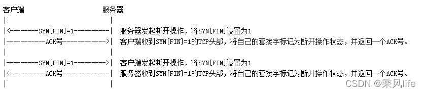 客户端或服务器完成数据发送后,会调用close接口发起断开连接。close内部采用即四次挥手实现,四次挥手使用控制位的BIT[FIN]和ACK号实现。