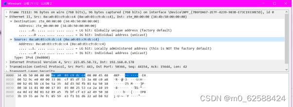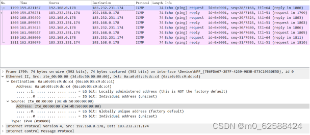 ?发出帧的目的 MAC 地址是192.168.0.178 以及返回帧的源 MAC 地址是183.232.231.174 这个 MAC 地址是我ping的百度的www.a.shifen.com的ip地址的。