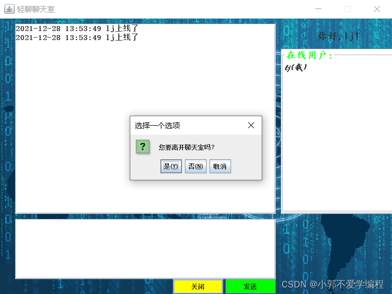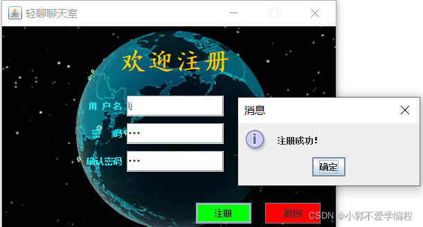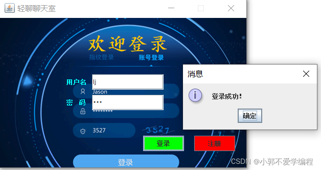 - 在实训中,利用简单的ETCP网络通信模式来扩展的聊天室,包括服务器启动关闭、登录、注册、聊天群发以及下线(带音效)等功能,还有连接了数据库JDBC的功能,同时对所有的界面进行美化,在登录,注册界面背景图片是动态的,可以实现多人聊天,私聊。