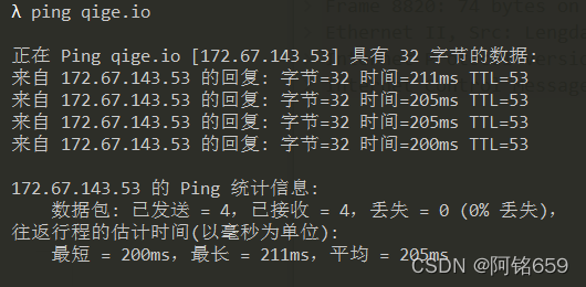 1.2.使用ip.addr == 172.67.143.53 and icmp过滤出与qige.io相关并且是icmp协议的信息: