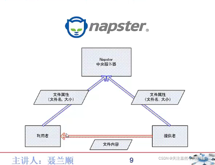 P2P(点对点结构)优点:高度可伸缩 缺点:难于管理 ? ?没有永远在线的服务器 ? ?任意端系统/节点之间可以直接通信 ? ?节点间歇性接入网络 ? ?节点可能改变IP地址 混合结构(前两种混合)Napster 文件传输P2P ?文件搜索采用C/S---集中式
