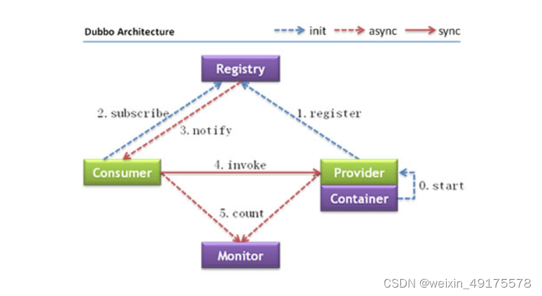 | 节点 | 说明 | | Provider | 暴露服务的服务提供方(生产者) | | Consumer | 调用远程服务的服务消费方(消费者) | | Registry???????? | 服务注册与发现的注册注册中心(nacos) | | monitor | 统计服务的调用次数和调用时间的监控中心(监控问题不影响服务调用) | | container? ? ? ? ? ? | 服务运行容器 |