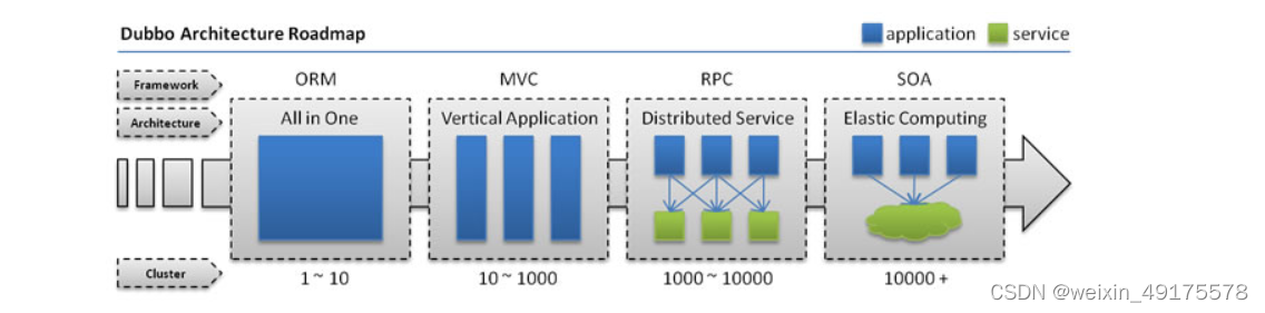 属于流动计算架构(SOA): 随着服务化的进一步发展,服务越来越多,服务之间的调用和依赖关系也越来越复杂,诞生了面向服务的架构体系(SOA),也因此衍生出了一系列相应的技术,如对服务提供、服务调用、连接处理、通信协议、序列化方式、服务发现、服务路由、日志输出等行为进行封装的服务框架