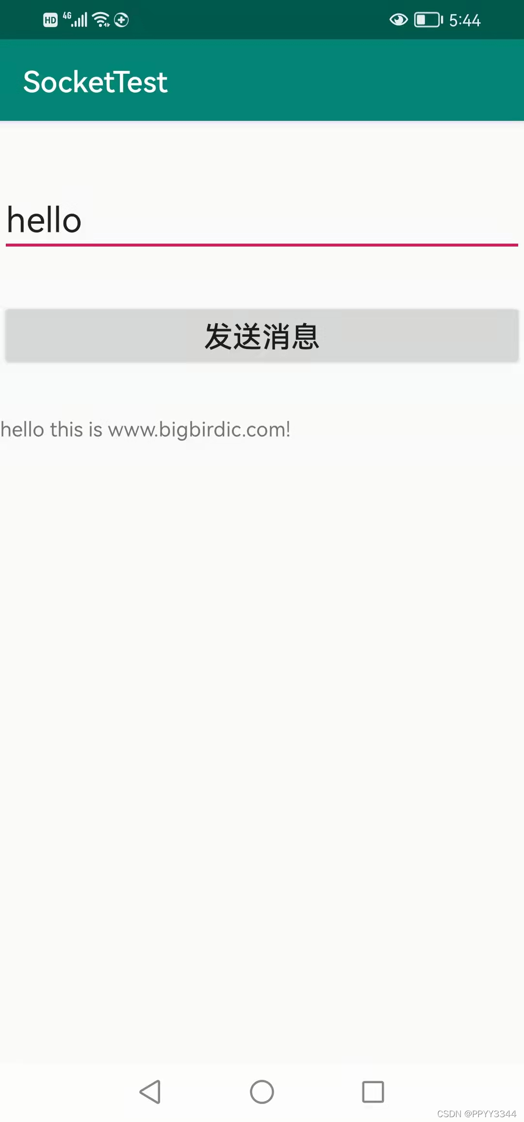 ? ? 在Activity中只是对点击事件做了处理,并将服务端返回的值展示在TextView上。添加完网络权限之后,运行程序,在EditText中输入内容,然后点击“发送消息”按钮,将“hello”发送到服务端,并接收到服务端返回的“hello this is www.bigbirdic.com!”,如图1-2所示。