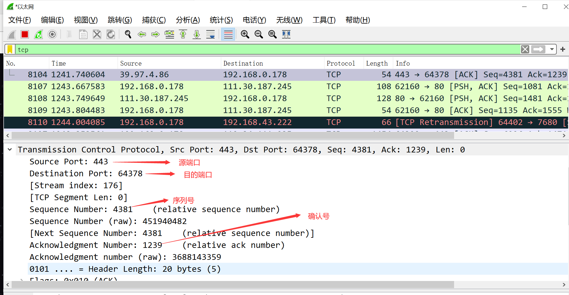 用 Wireshark 任意抓包(可用 tcp 过滤),熟悉 TCP 段的结构,如:源端口、目的端口、序列号、确认号、各种标志位等字段。