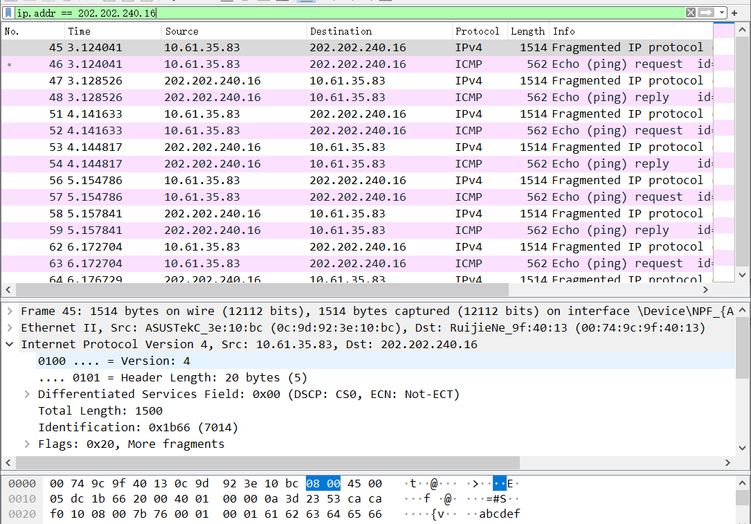 根据规定,一个 IP 包最大可以有 64K 字节。但由于 Ethernet 帧的限制,当 IP 包的数据超过 1500 字节时就会被发送方的数据链路层分段,然后在接收方的网络层重组。 缺省的,ping 命令只会向对方发送 32 个字节的数据。我们可以使用 ping 202.202.240.16 -l 2000 命令指定要发送的数据长度。此时使用 Wireshark 抓包(用 ip.addr == 202.202.240.16 进行过滤),了解 IP 包如何进行分段,如:分段标志、偏移量以及每个包的大小等   Q:分段与重组是一个耗费资源的操作,特别是当分段由传送路径上的节点即路由器来完成的时候,所以 IPv6 已经不允许分段了。那么 IPv6 中,如果路由器遇到了一个大数据包该怎么办? A:路由器会重新排列以及组合。