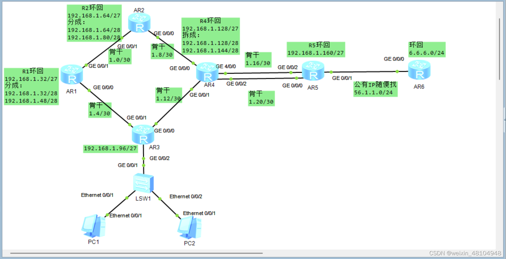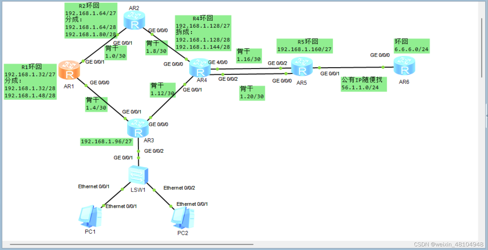 为了便于汇总,便于管理,可以只给R1,R2,R4分别分配一个网段,各自下去在子网划分