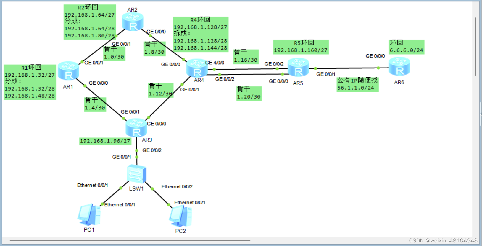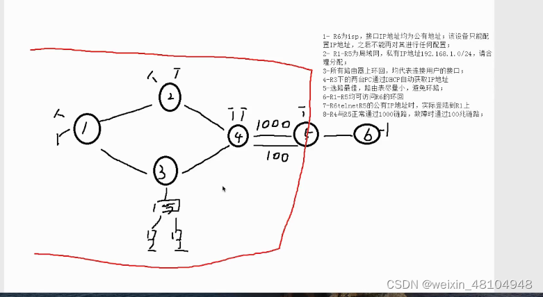 R1,R2,R4上都有两个环回接口;R3下连的是交换机,交换机下再连2台点电脑;相当于R1,R2,R4需要6个IP地