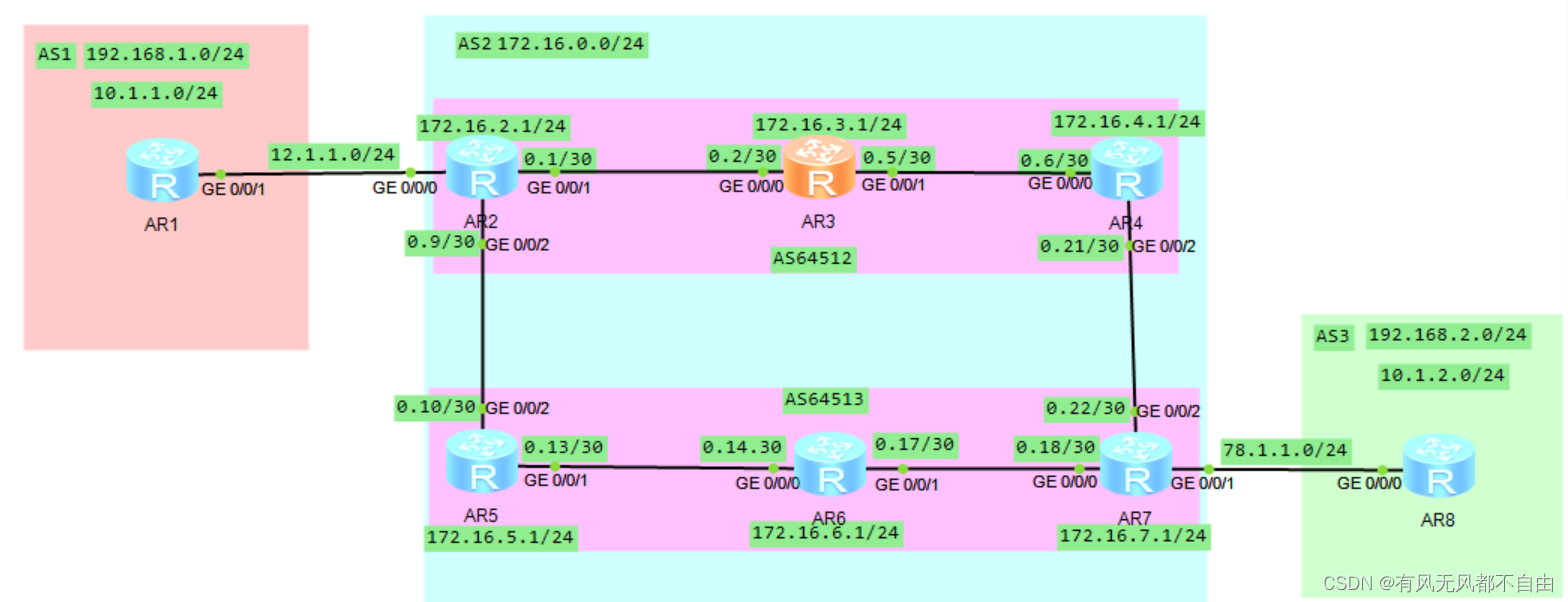 1、AS1存在两个环回, 一个地址为192.168.1.0/24该地址不能在任何协议中宣告AS3存在两个环回, 一个地址为192.168.2.0/24该地址不能在任何协议中宣告 最终要求这两个环回可以互相通讯; AS1的另一个环回为10.1.1.0/24 AS3的另-个环回为10.1.2.0/24 2、整个AS2的ip地址为172.16.0.0.请合理划分 3、AS间的骨干链路ip地址随意定制 4、使用BGP协议让整个网络所有设备的环回可以相互访问 5、减少条目数量,避免环路出现 ?