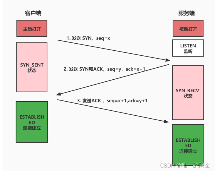 这个过程就是三次握手,首先客户端向服务器端发送是否可以连接的请求,服务器端接受到请求后确认客户的 SYN,并向客户端发送自己的 SYN 包,客户端接收到服务器发来的包之后向服务器发送确认包从而完成三次握手。文章第2点已详细介绍了。
