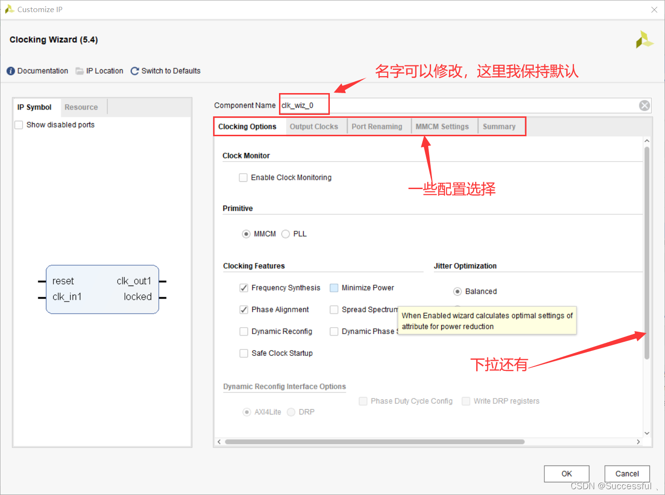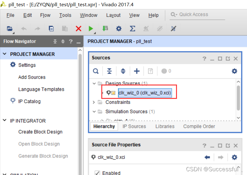 1、新建一个 工程,点击 Project Manager 界面下的 IP Catalog。  2、在IP Catalog中搜索clock,打开下面的 Clocking Wizard,双击打开配置界面。  配置界面  3、 Clocking Wizard 的名字可以修改, 这里我不做修改。在第一个界面 Clocking Options 里, 我们选择 PLL 资源,输入的时钟频率为 50Mhz。  4、 在 Output Clocks 界面里选择时钟输出,这里我选择 clk_out1~clk_out4 四个时钟的输出,频率分别为 100Mhz, 75Mhz, 50Mhz, 25Mhz。这里还可以设置时钟输出的相位,我们不做设置,保留默认相位,点击 OK 完成,(我们可以在左侧预览)  5、在弹出的对话框中点击 Generate 按钮生成 PLL IP 的设计文件。  6、这时一个 clk_wiz_0.xci 的 IP 会自动添加到我们的 项目中, 可以双击它来修改这个 IP 的配置 选择 IP Sources 这页,然后双击打开 clk_wiz_0.veo 文件,这个文件里提供了这个 IP 的实例化模板。我们只需要把框框的中内容拷贝到我们 verilog 程序中,对 IP 进行实例化。  7、下面新建一个顶层文件,并将pll 实例化模板copy进去,做一些修改   代码如下: