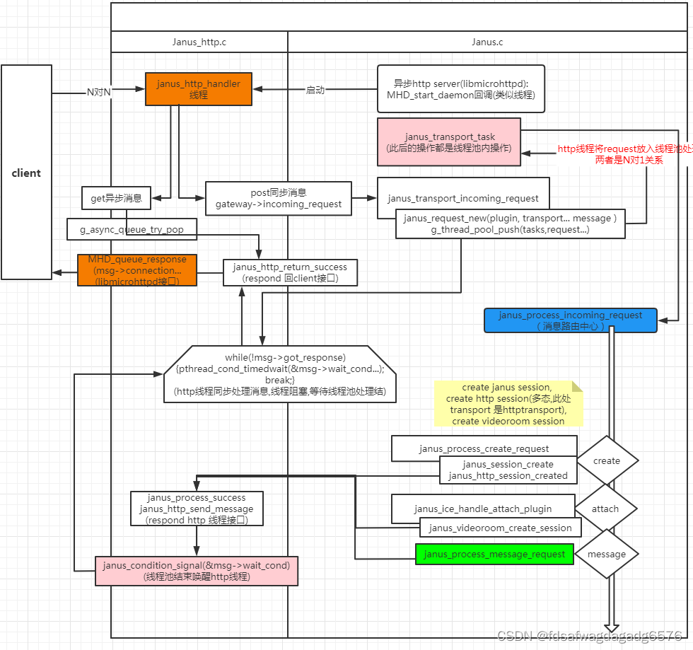 概况: Janus http 3条消息处理create,attach,message:join,目的是交换sdp. http线程和线程池是N对1.? http线程和线程池线程同步:msg->signal==>msg->cond_wait http线程和client线程同步:msg->connection 基于msg驱动,没有为每个client创建对象. janus_http.c是通信层:输入输出接口都在这里.(http session也是为通信服务的) janus.c是控制层:线程池和路由中心都在这里