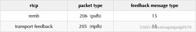 ?这两种与拥塞控制相关的 RTCP 报文的类型如下表所示: 正如?Remb ?作为 Receive-side BWE 的关键 RTCP 报文,Transport Feedback ?则作为 Send-side BWE 的关键 RTCP 报文,它们是拥塞控制算法架在发送端与接收端之间的一座桥梁。