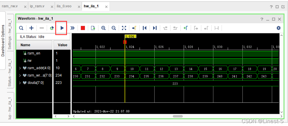 添加ila ip用来探测信号,同样的操作在ip catalog中搜索ila双击打开配置界面,因为要探测五个信号:ram使能信号、读写操作信号、ram地址信号、ram读写数据信号、最后输出的信号douta。所以number of probes 探针的数量为5,在每个探针的位宽中配置相对应的数据位宽。同样的在ip sources中的veo文件拷贝ila的例化模板,粘贴到顶层模块ip_ram的代码中,最终其代码如下: