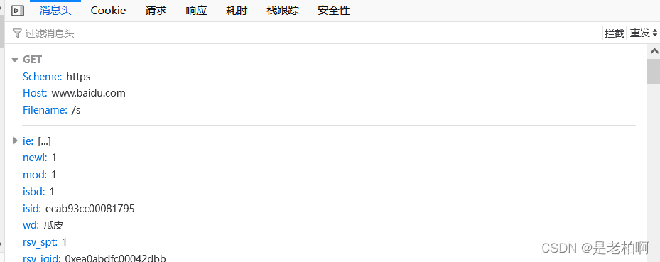 找到请求数据包查看请求头,发现请求方法为GET方法,请求携带的数据wd正是我们输入的关键词,那么我们就可以在请求的数据字典中带入我们的关键词。