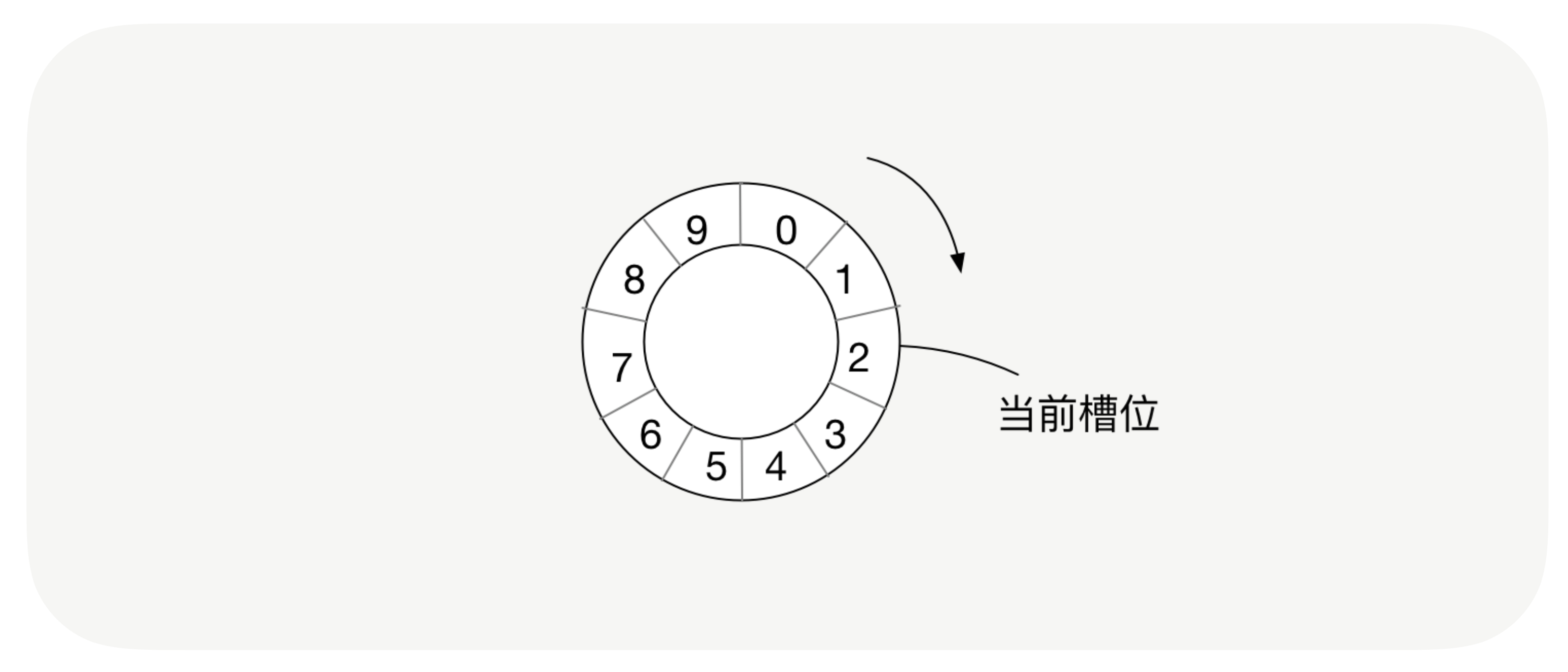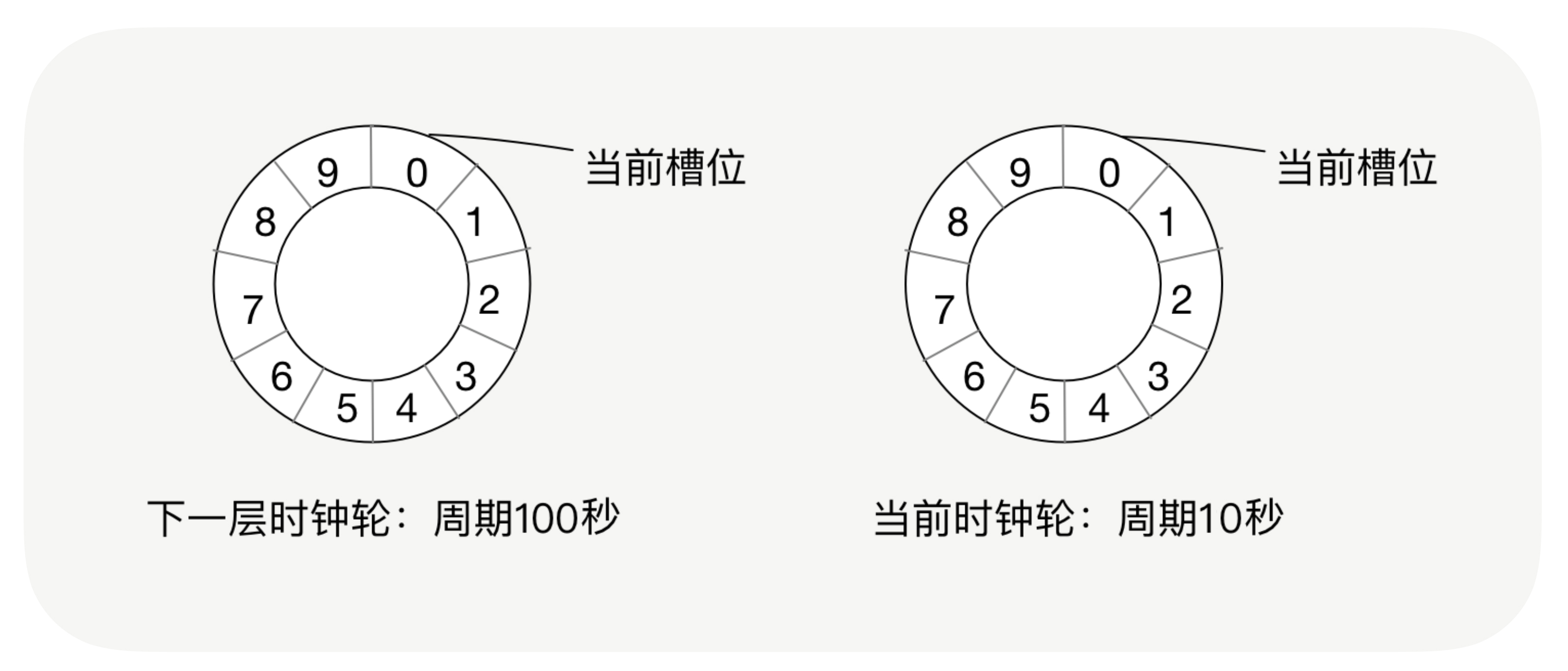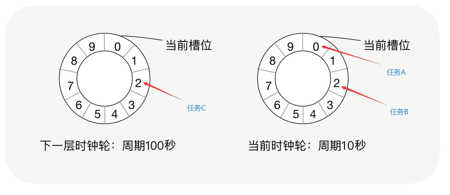 对于以上问题, 目的是要减少额外的扫描操作就可以了。比如说一个定时任务是在5 秒之后执行,那么在 4.9 秒之后才扫描这个定时任务,这样就可以极大减少 CPU开销。这时我们就可以利用时钟轮的机制了。  时钟轮的实质上是参考了生活中的时钟跳动的原理,那么具体是如何实现呢? 在时钟轮机制中,有时间槽和时钟轮的概念,时间槽就相当于时钟的刻度;而时钟轮就相当于指针跳动的一 个周期,我们可以将每个任务放到对应的时间槽位上。 如果时钟轮有 10 个槽位,而时钟轮一轮的周期是 10 秒,那么我们每个槽位的单位时间就是 1 秒,而下一层时间 轮的周期就是 100 秒,每个槽位的单位时间也就是 10 秒,这就好比秒针与分针, 在秒针周期下, 刻度单位为 秒, 在分针周期下, 刻度为分。  假设现在我们有 3 个任务,分别是任务 A(0.9秒之后执行)、任务 B(2.1秒后执行)与任务 C(12.1秒之后执 行),我们将这 3 个任务添加到时钟轮中,任务 A 被放到第 0 槽位,任务 B 被放到第 2槽位,任务 C 被放到下一 层时间轮的第2个槽位,如下图所示:  通过这个场景我们可以了解到,时钟轮的扫描周期仍是最小单位1秒,但是放置其中的任务并没有反复扫描,每个 任务会按要求只扫描执行一次, 这样就能够很好的解决CPU 浪费的问题。