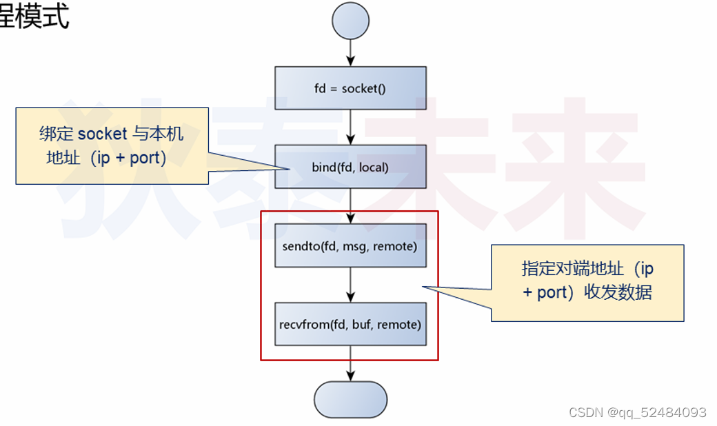 UDP 在数据收发前不需要先建立连接,只需要在收发数据的时候指定好对端的 IP 地址和端口号即可,客户端不需要收发数据前不需要绑定 Socket 和 地址,如果未绑定,那么就会随机指定一个可用的 IP 地址和端口号。