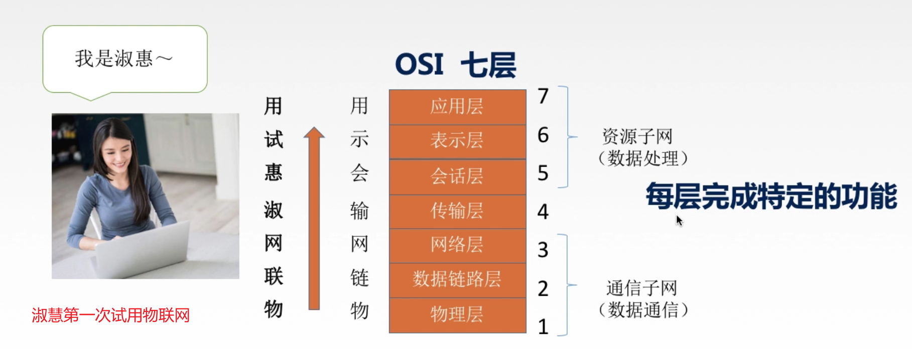 将每一层的第一个字提取出来,由第一层到第7层,得到一个记忆口诀:物联网淑慧试用