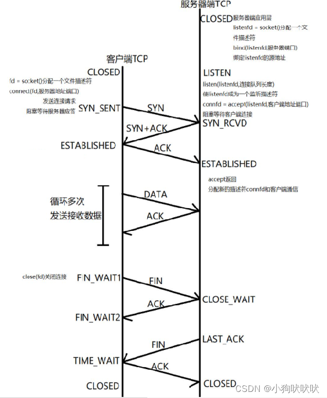 [CLOSED -> LISTEN]服务器端调用listen后进入LISTEN状态,等待客户端连接 [LISTEN -> SYN_RCVD]一旦监听到连接请求(同步报文段),就将该连接放入内核等待队列中,并向客户端发送SYN确认报文. [LISTEN -> ESTABLISHED] 收到客户端的ACK后进入该状态,连接成功建立。