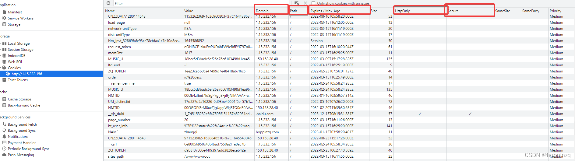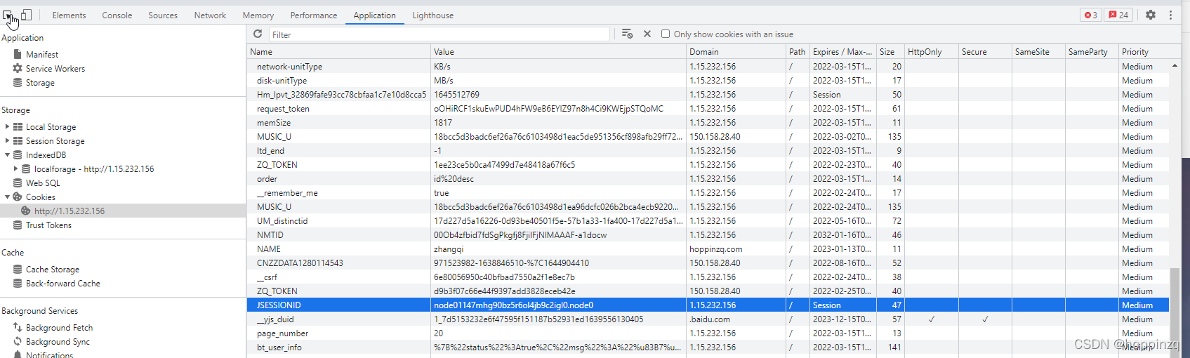 ? ? ? ? 我们登录之后呢,可以把用户信息存入session中,然后生成一个sessionId,它的生命周期也是我们设置的,是一次“会话”。这个sessionId存在哪呢?可以是数据库,也可以是redis,但是我们先把它存到Cookie内。有趣的是,这个sessionId是会自动种到Cookie里的。(下图的JSESSIONID就是,图片来自于我的博客网站)