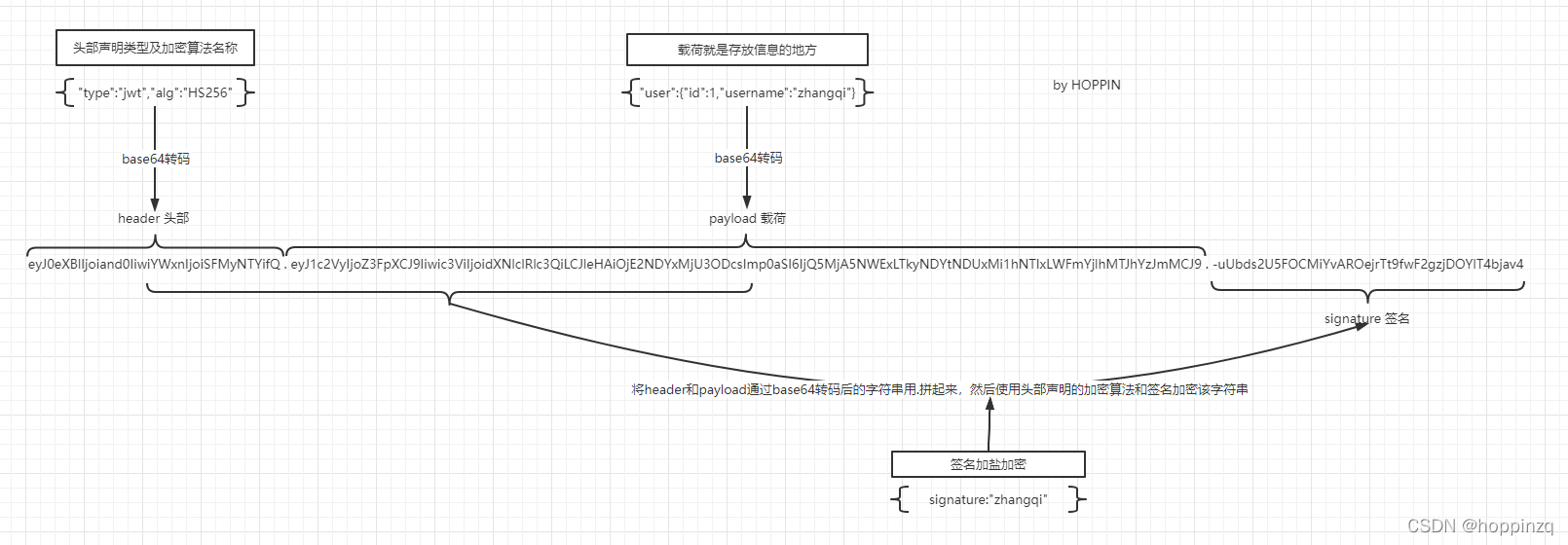 ? ? ? ? ?上图就是jwt的内容,它由三部分组成,分别是header头部,payload载荷部分以及signature签名部分。根据官网,我们可以看到:头部主要是类型以及加密算法的声明,然后通过base64编码形成jwt的第一部分;载荷我们可以存取用户信息,然后通过base64编码形成jwt中间部分;尾部是将base64编码的头部和编码后的载荷部分,中间以.拼接起来之后,通过定义的加密算法(HS256)经签名后加密的字符串,最后三部分用.拼起来就是具有jwt规范的token。有人会问:都知道你载荷用base64编码了,我拿到cookie里的token然后把两个.中间的载荷取出来用base64解码不就拿到用户信息了?确实,但是它不是用来防止伪造请求的,而是用来防止篡改,这就是签名的作用,不如先看看下面代码。