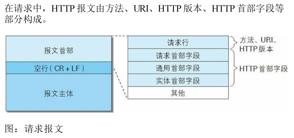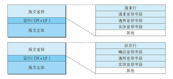 ??请求行:包含用于请求的方法,请求URI和HTTP版本 ??状态行:包含表明响应结果的状态码,原因短语和HTTP版本。 ??首部字段:包含表示请求和响应的各种条件和属性的各类首部。 ??其他:可能包含HTTP的RFC里未定义的首部(Cookie等)。