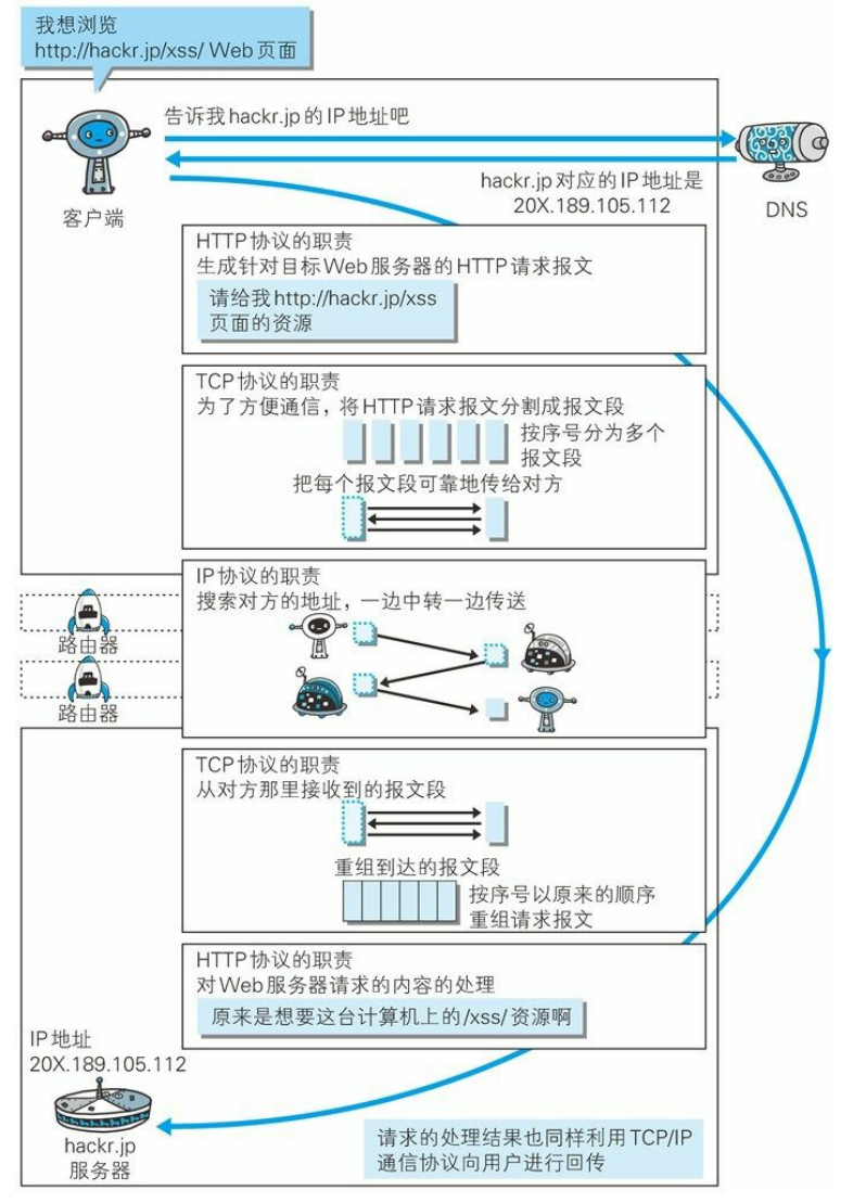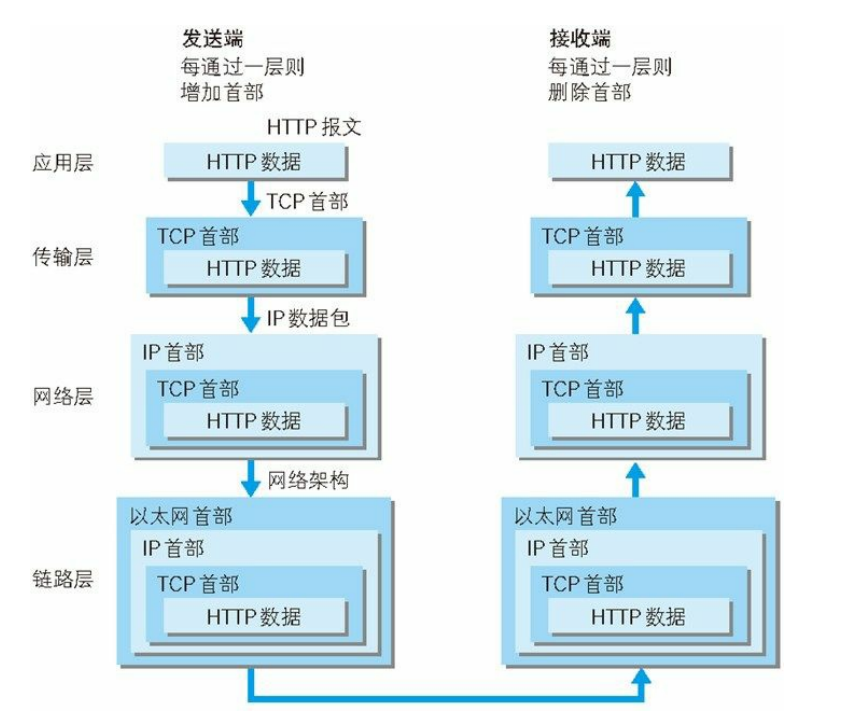 ??客户端在应用层(HTTP协议)发出一个想看某个Web页面的HTTP请求。在传输层(TCP协议)把从应用层收到的数据(HTTP请求报文)进行分割,并在每个报文打上标记序号及端口号后转发给网络层。网络层(IP协议)增加作为通信目的地的MAC地址后转发给链路层。接收端的服务器在链路层接收到数据,按序往上层发送,一直到应用层。当传输到应用层,才能算真正接收到由客户端发送过来的HTTP请求。
